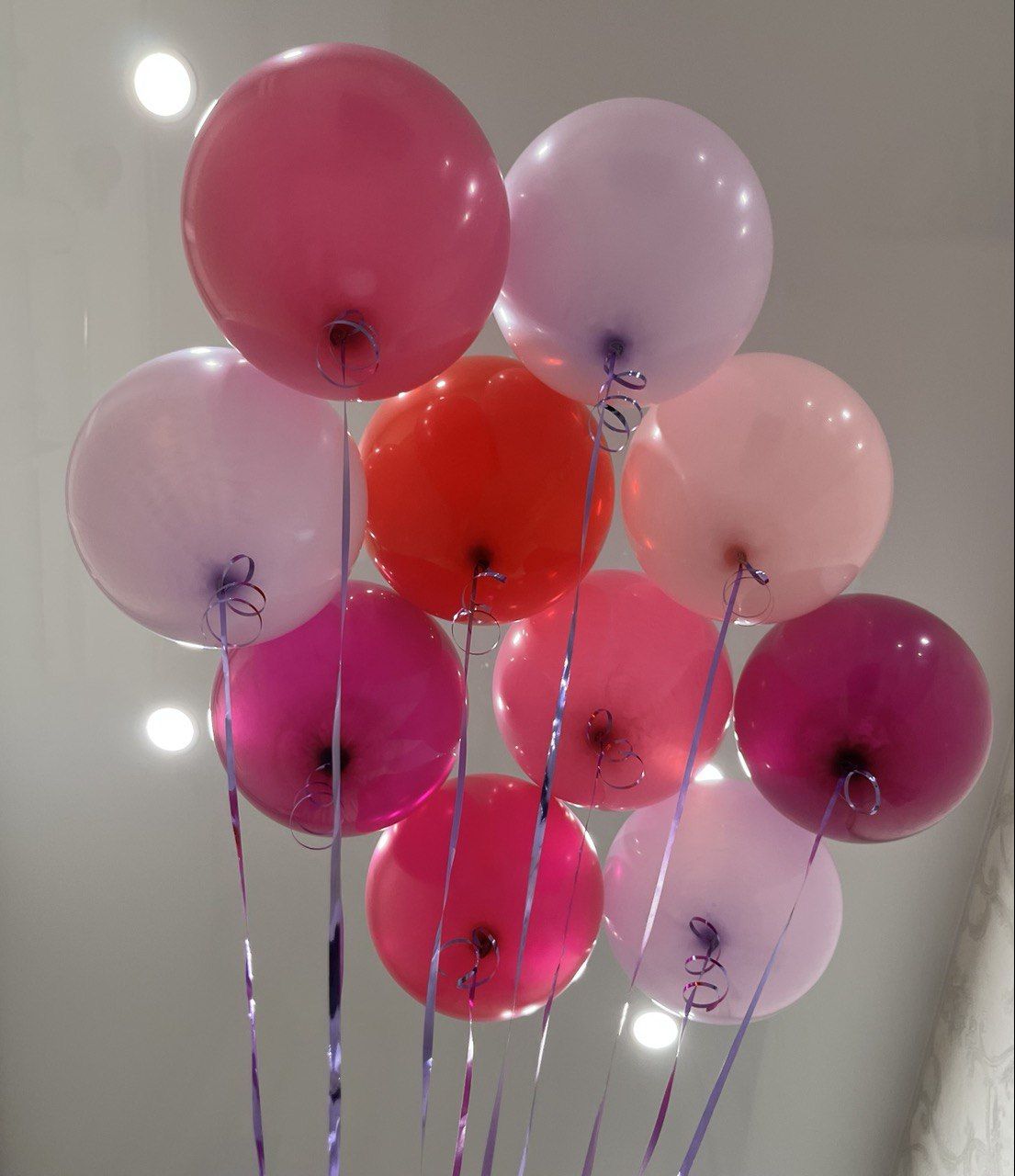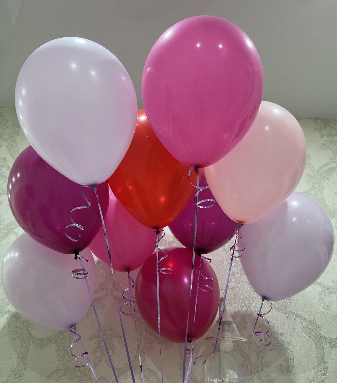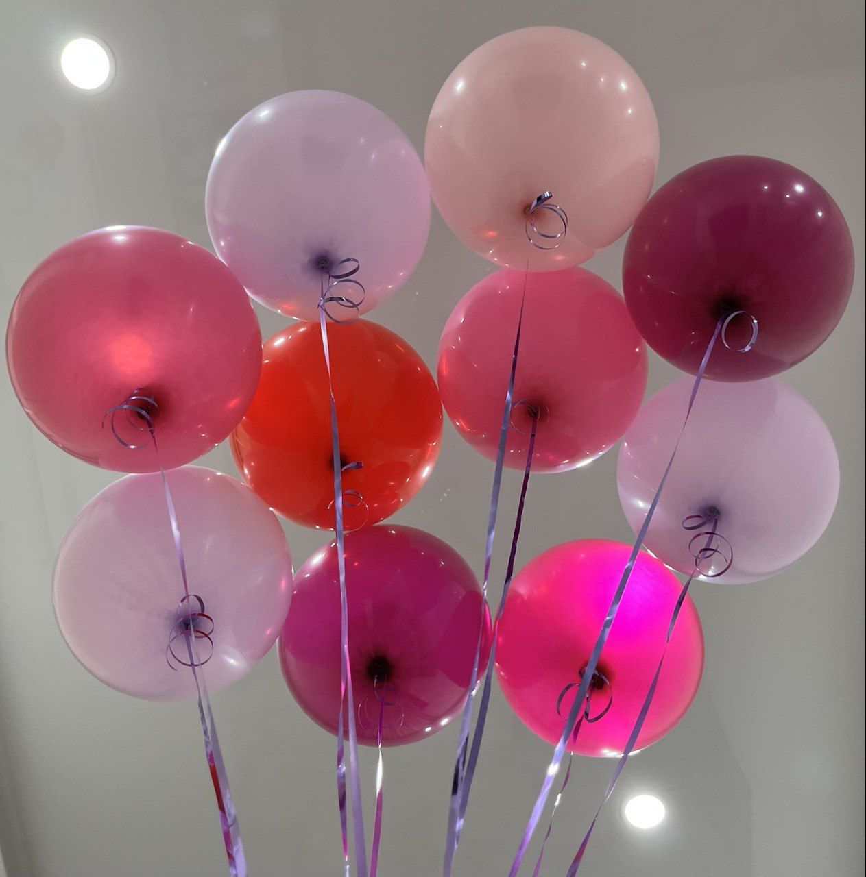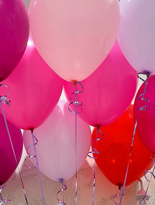 - 10 гелиевых шаров розовых оттенков с ленточками (малиновый, фуксия, розовый, лаванда).