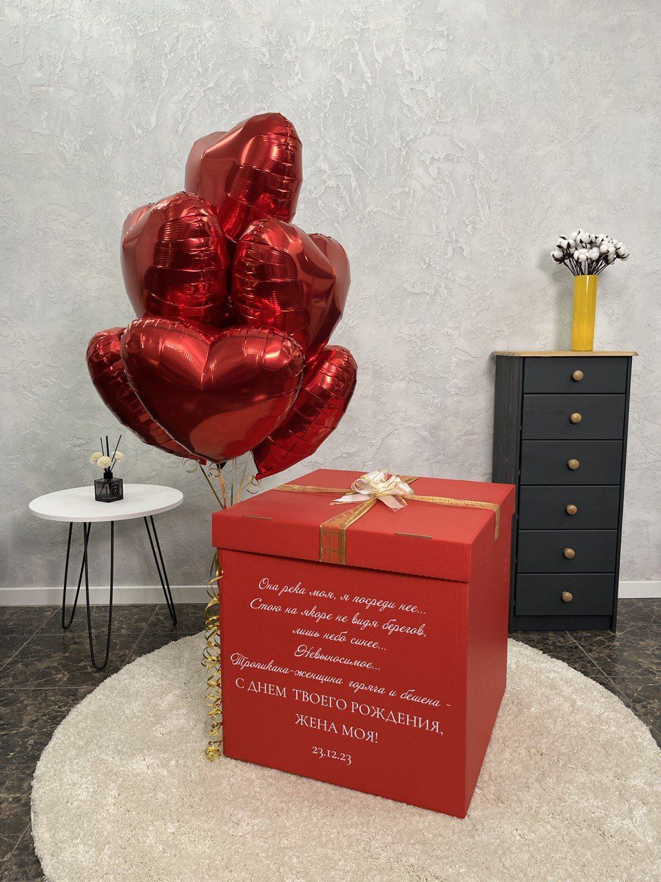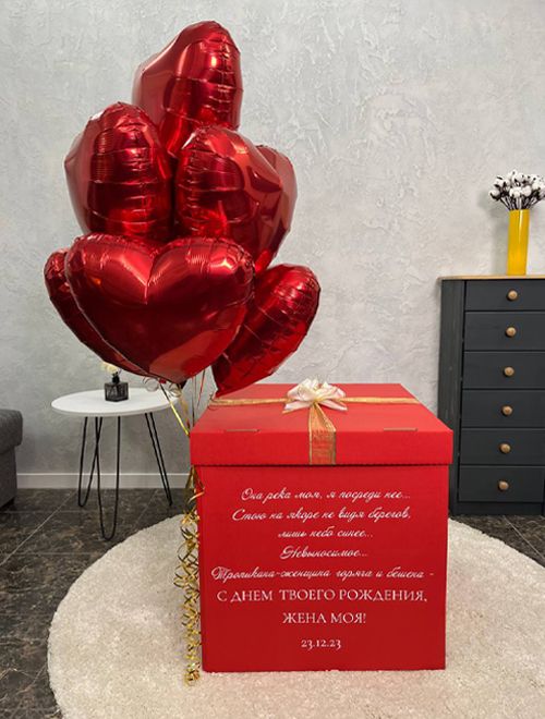 Коробка-сюрприз красная с текстом песни (стих) и 7 сердцами
