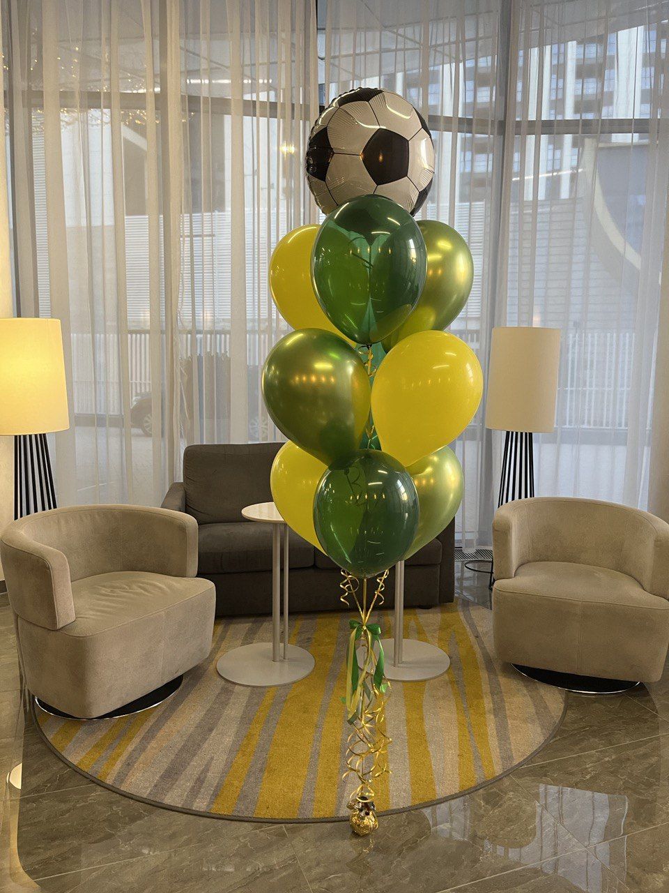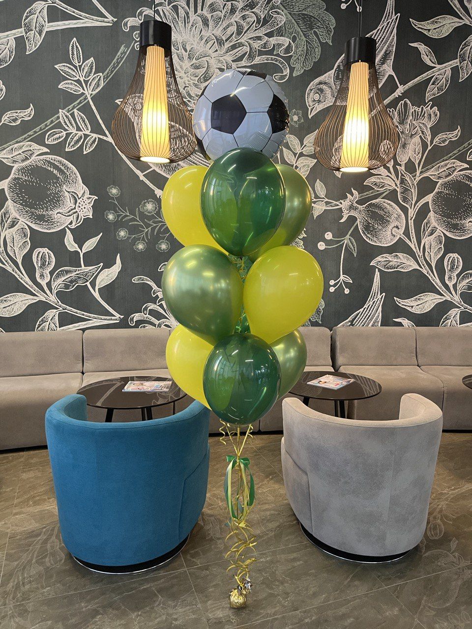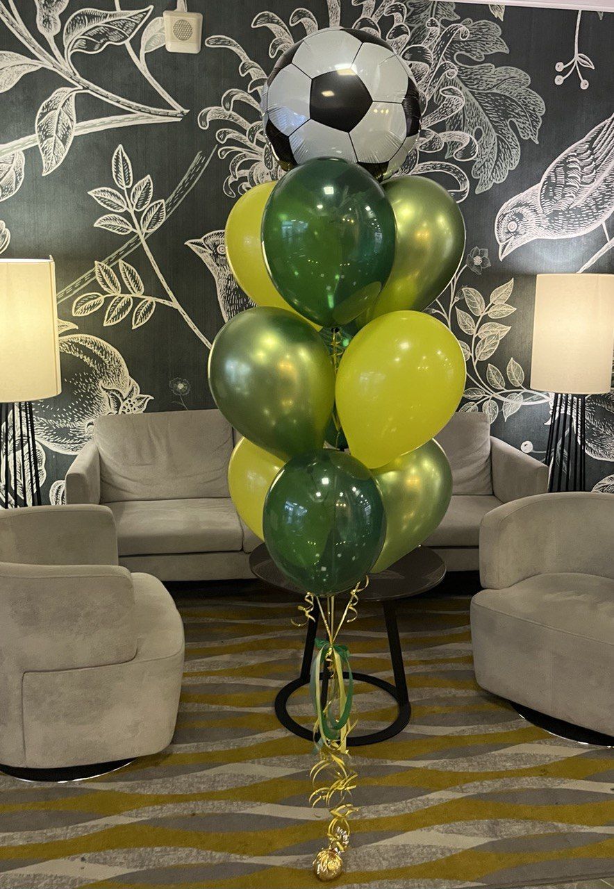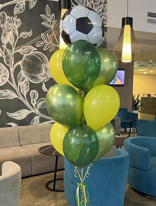 фонтан из 10 шаров на грузике, в котором шар в виде футбольного мяча.
