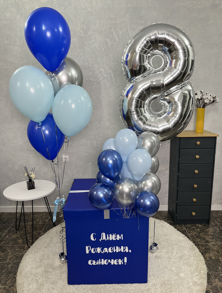 Коробка-сюрприз синяя с 15 шариками внутри + фонтан из 5 шаров и цифра рядом
