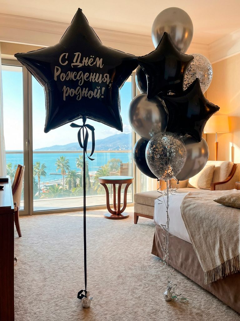 - фонтан из 10 шаров в котором (2 чёрных шара, 2 чёрные звезды, 3 прозрачных шара с конфетти, 3 серебристых хромированных шара).
