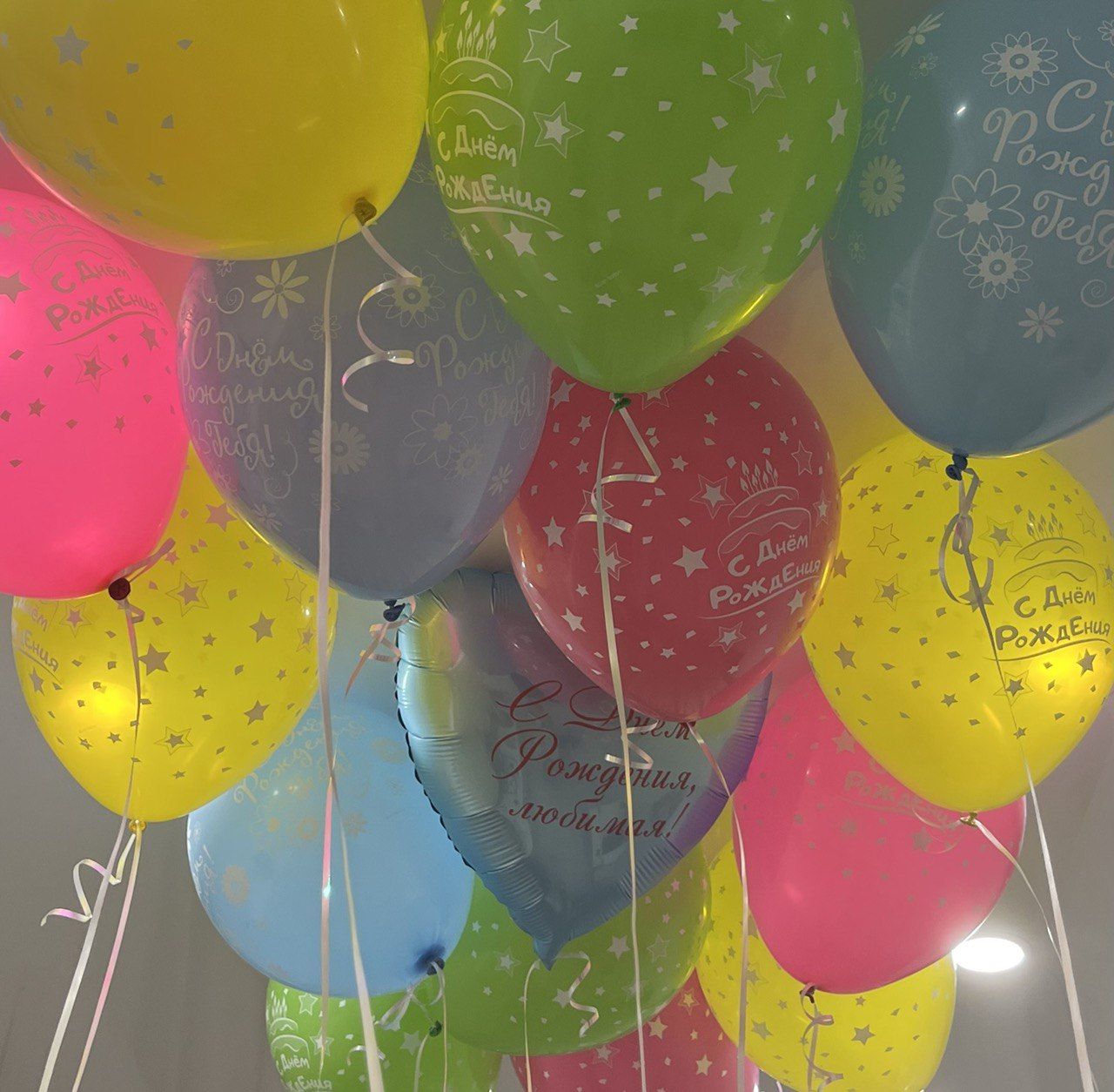 - 14 разноцветных шаров с надписью С Днём Рождения;